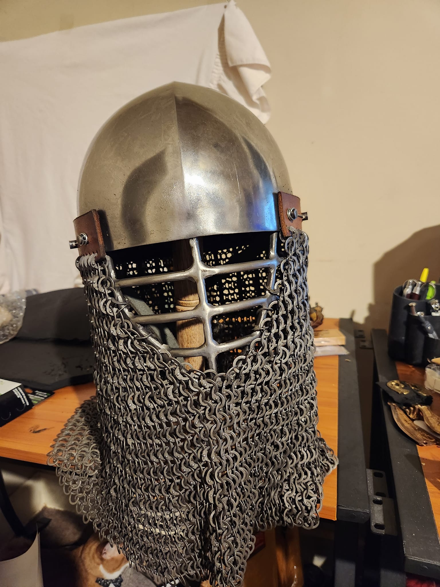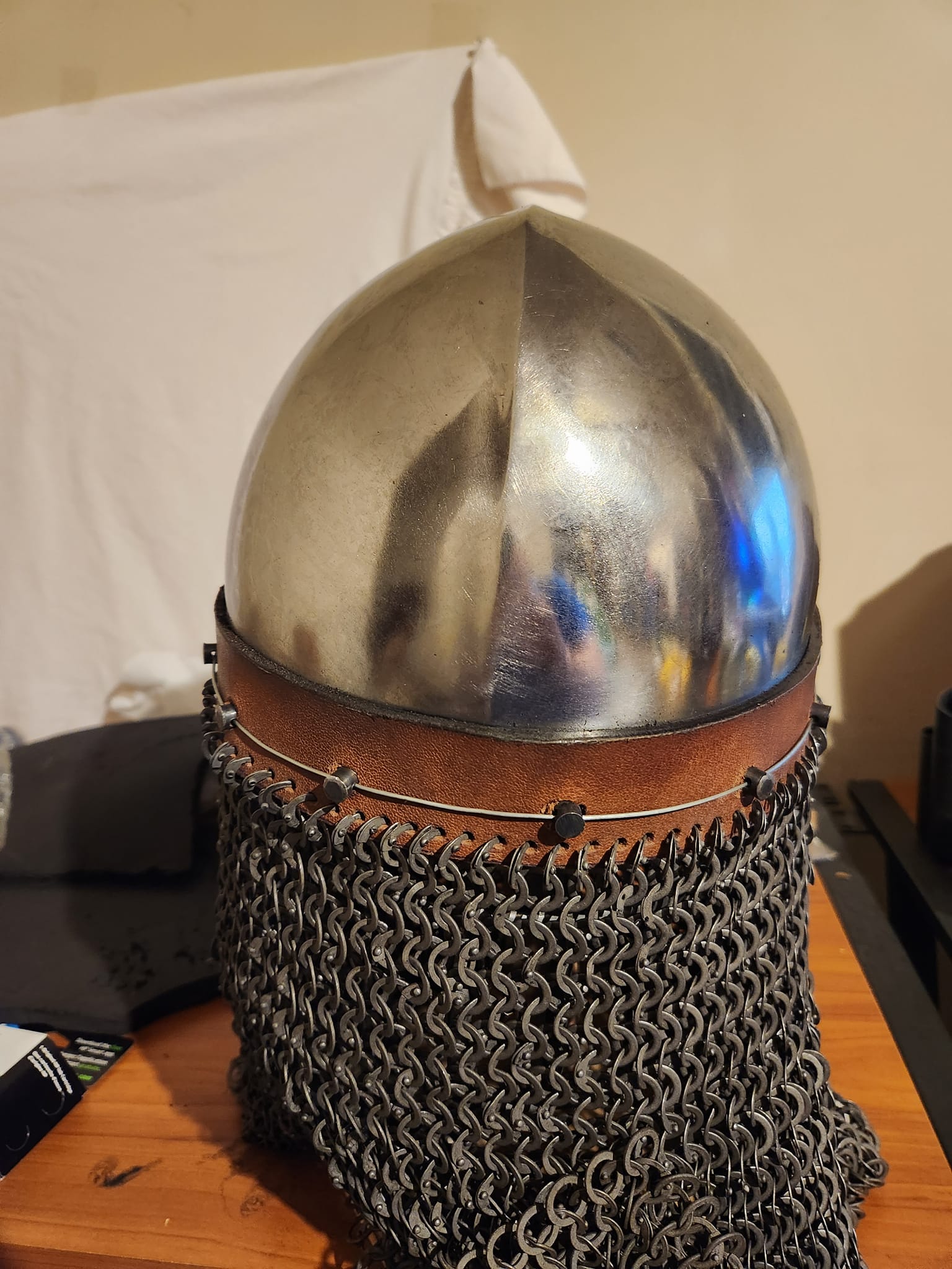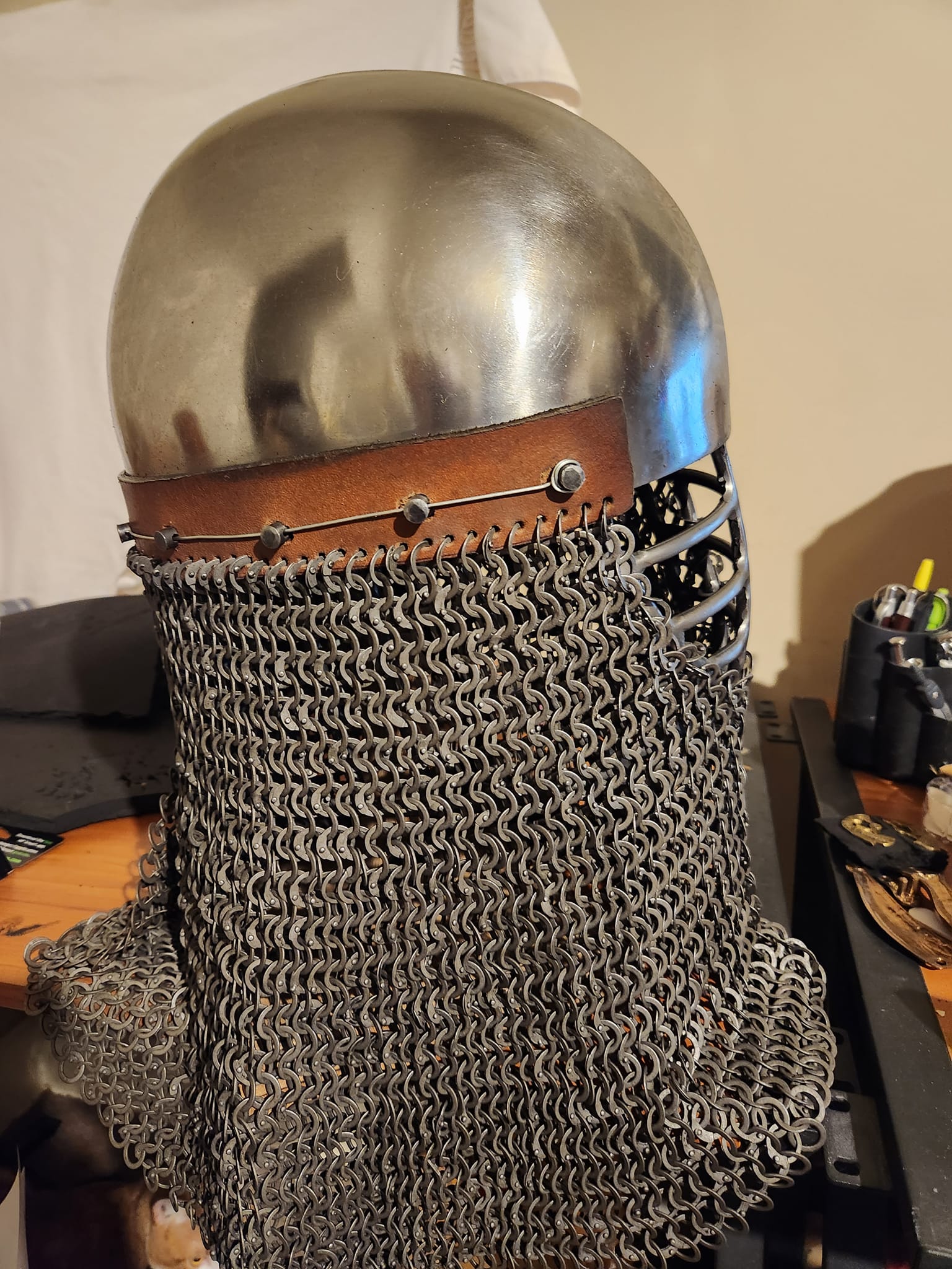 With internal cage for better ventilation. Great early to mid 14th C. Helmet which later developed into the Bascinet